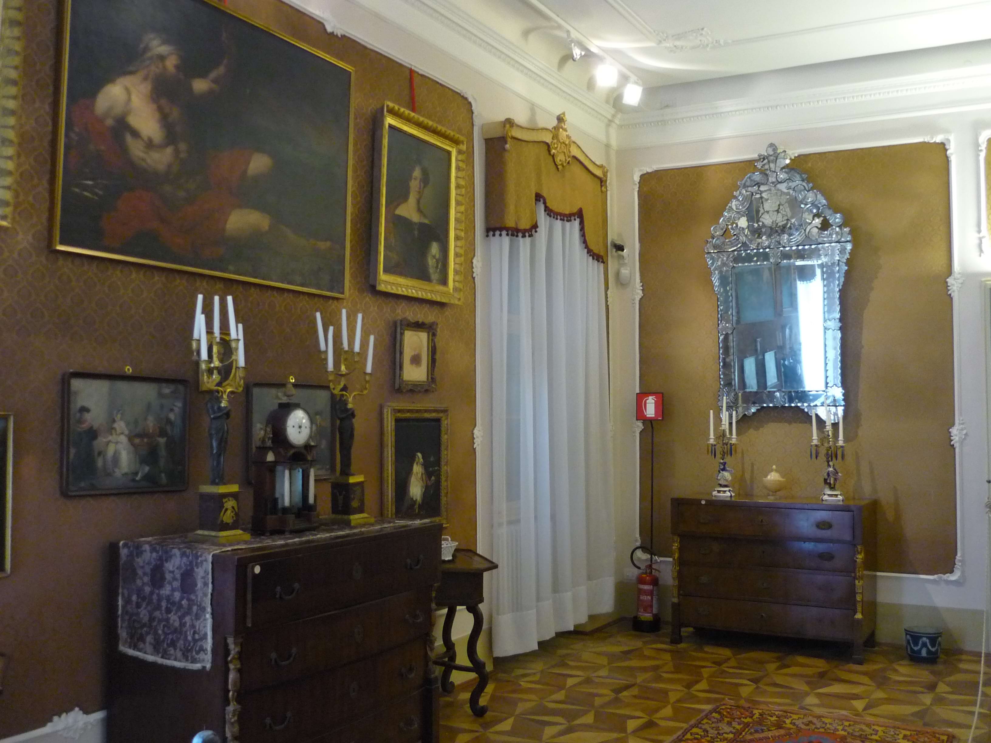 Above the eclectic-style lounge area, consisting of a sofa and five chairs with striped silk upholstery, the wall is almost entirely occupied by numerous paintings, most notably the Head of a Possessed Man, which can be traced back to the ambit of Peter Paul Rubens, and a Scene of Gypsies and Soldiers by Alessandro Magnasco (1667-1749), one of the most original and visionary painters of 18th century Italy. On the opposite wall are other interesting paintings: in the centre Jonah and the Whale by the Genoese artist Giambattista Langetti (1635 -1676), flanked by the Portraits of Gian Cristoforo and Amalia Ritter de Zàhony by an early 19th-century Viennese artist, and on the lower left the Portraits of Marie Antoinette and her children Louis and Maria Theresa Charlotte by the German painter Ludwig Guttenbrunn.